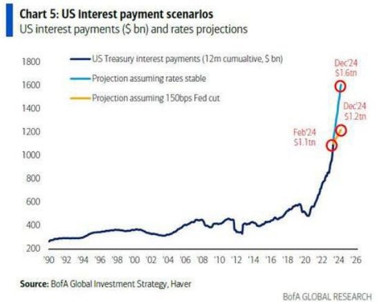 We know these higher rates are transferring risk free interest money to the private sector and that US government interest payments are projected to hit $1.6T by December assuming stable rates: