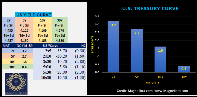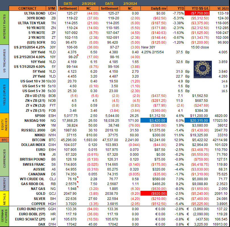 Let’s just start things off with the settlement sheet for trade date Friday February 9th. The US Bond markets swallowed down the new auctions pretty well as the 10Y and 30Y both were well bid and as we explained last week, saw solid demand. Despite the new supply in the longer end the US Bond markets were flatter on Friday with once again the short end seeming to be the focus of the selling. Here is a look at the US Bond curve from Friday: