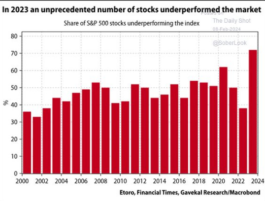 We also know that in a financial investment digital world by which systematic AI algorithmic Mechanical Investors (SAMIs) dominate and will continue to play a massive role in capital allocation, it only makes sense that the wealth concentration becomes more acute and it is merely a self fulfilling prophecy by design because capital chases alpha and capital flees negative attributes no matter what! A key demonstration of this phenomenon is non other than this chart from SoberLook on X showing how 2023 was a record year for the share of underperforming stocks in the SP500. We believe this will continue: