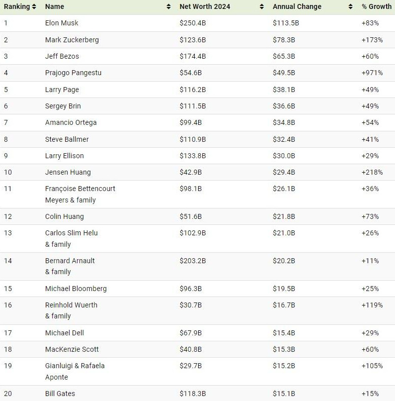 So it should be no wonder that over 2023 the top 20 wealthiest individuals nominal change in worth grew by $694 Billion in one year! The top 20 are worth a collective $2.05T: