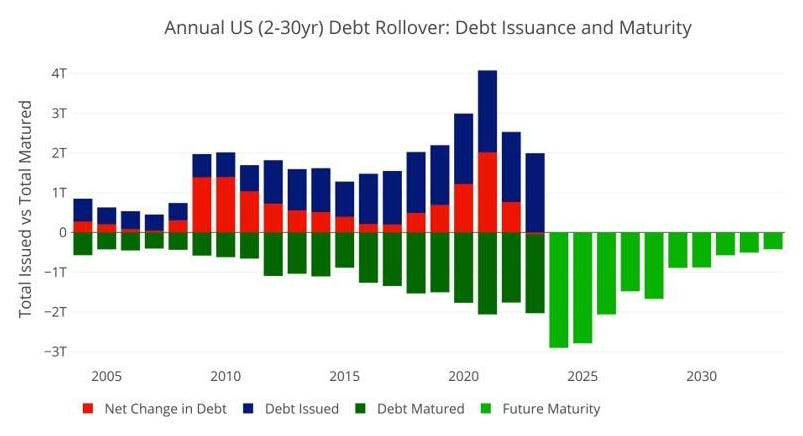 All in all this is a pivotal week for markets and we know the debt problem as well is becoming increasingly problematic for the US treasury and 2024 and 2025 sees nearly $3T in maturing debt consecutively that has to be refinanced. Do we honestly think this can be done in a higher rate, QT environment? We do not and this is why we feel the FOMC will cut rates earlier and more aggressively than most think: