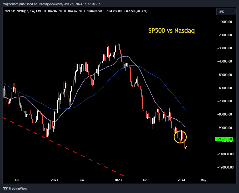 When we look at the spread chart we can see that the end of the week showed some resiliency of the SP500 vs the Nasdaq and this breakdown may have been just a false move and this week is important in confirming that:
