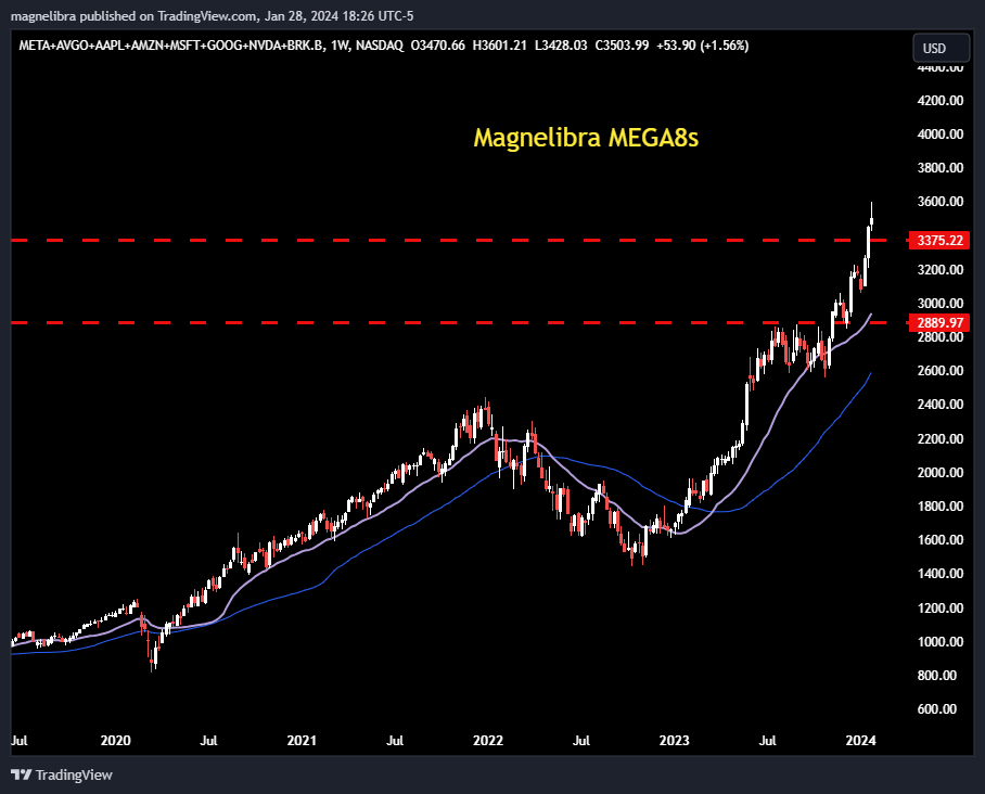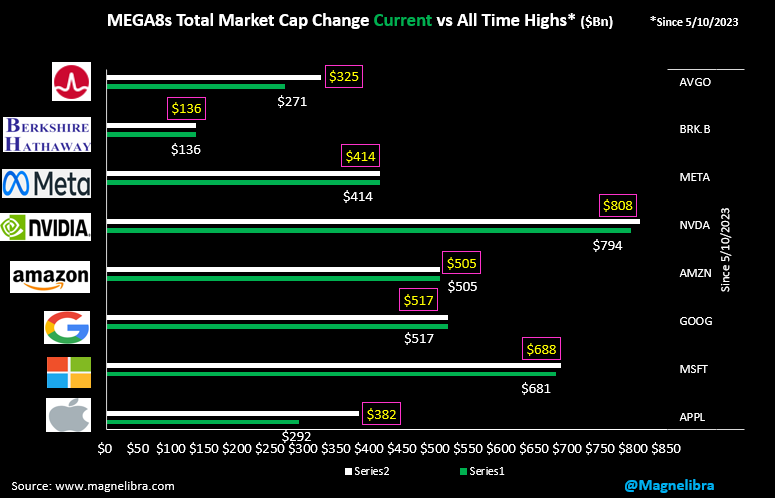 When we look at the total Market Cap chart Berkshire, Meta and Google continue to make new highs with Microsoft and Nvidia pulling back some for now: