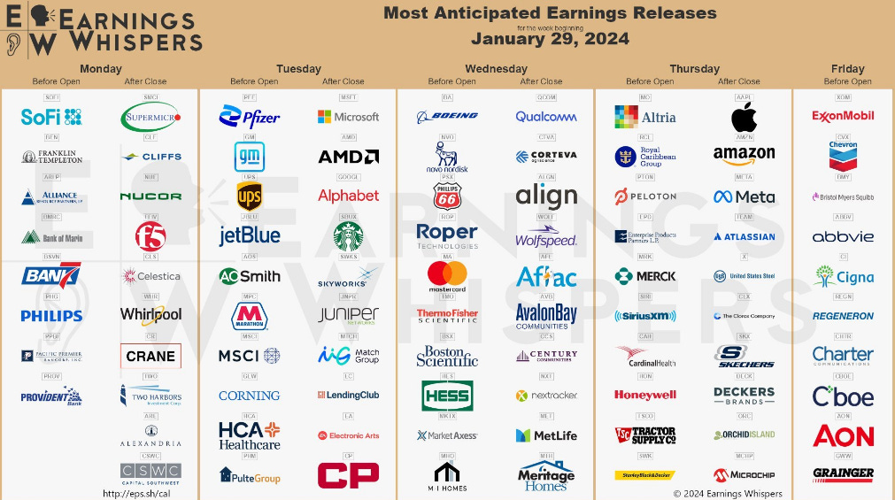 So this week is the biggest corporate earnings of the season in regards to the number of firms reporting. Earnings Whispers posted this excellent graphic of this weeks releases, highlighted by the tech heavy weight’s on Tuesday, with Microsoft and Alphabet and Thursday releases coming from Apple, Amazon and META: