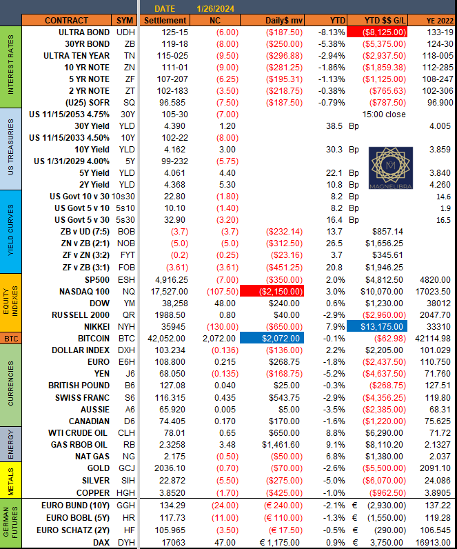 As far as the MEGA8s Berkshire was the leader on Friday with our new addition the worst performer of course. Also please note the addition of the QQQ 426C 2/2 expiry as the hedge for this week. Seasonality does not favor the equities here over the next 2 months and we believe this hedge is appropriate at this point: