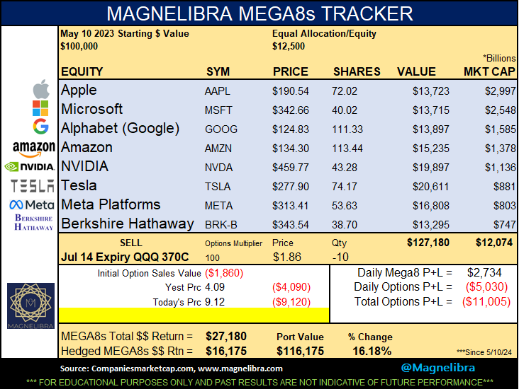 The overall outright position was +$2734 today but the option hedge cost the tracker $5030. So this is where the decision needs to be made, but for us this is a tutorial tracker and one where we created to focus our investment profiles on these large Megacap stocks as we know this is where a lot of the money is being concentrated. The MEGA8s are up $1 Trillion in market cap in just over 2 months!