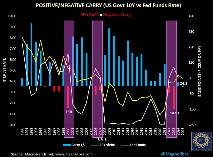 Here is a chart that we also share from time to time, it shows the difference in the yield of the Federal Funds (FF) rate and the US 10Y rate. When 10Y rates are higher than FF rate then this would be considered a negative yield curve or “negative carry” attribute. We have noticed throughout history that these negative carry years precede years of higher volatility and risk off generally. We narrowly averted a negative carry ending year last year but 2022 and 2023 where the markers we are using for today to indicate that volatility will increase here and perhaps we get a revaluation of equity and real estate, adding more fire to our thesis.