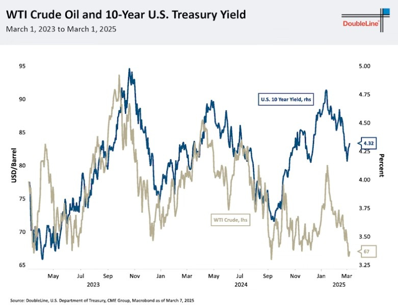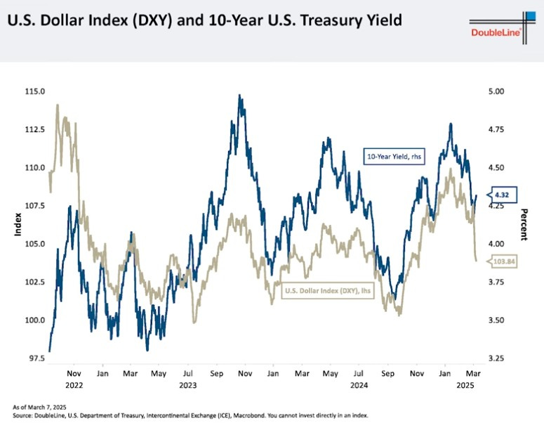 We also wanted to touch upon the DoubleLine webcast we viewed and share a couple of highlights. We highly recommend you guys watch this whole webcast, it is important to listen to what Jeff G has to say, we have followed him for decades and he is the best bond guy out there that we know. The first chart we want to share is the US dollar vs US 10 yield. The dollar has been under attack here for the last month and what this chart points out is the correlation between the US dollar and yields and with the US dollar falling, we should expect US 10Y yields to follow suit: