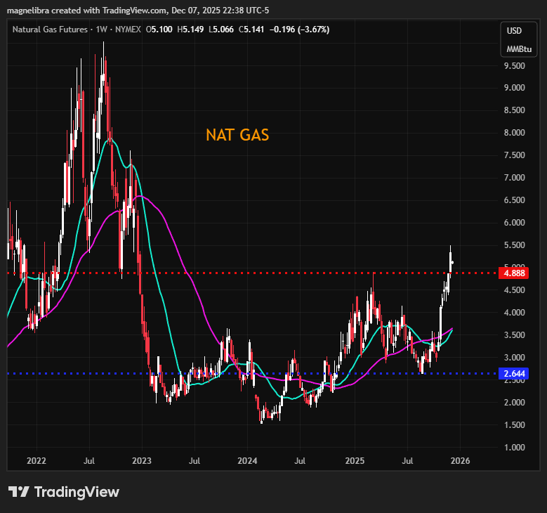 Nat Gas futures have breached the 4.88 level and now it will be up to the bulls to hold that level this week: