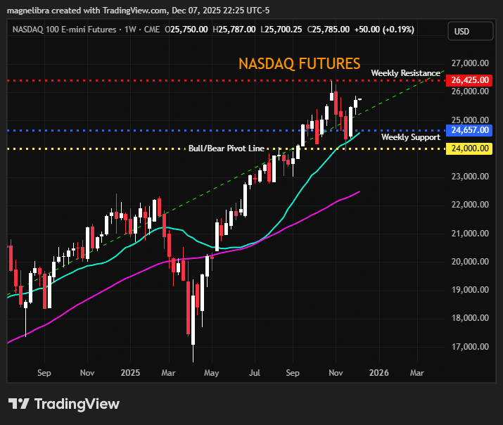 Same pattern exists in the Nasdaq futures where the upside target remains new highs above 26425 with weekly support down at 24657 and 24000 remains our pivot area: