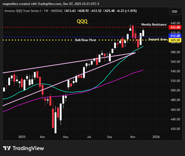 Before we get into the subscriber only data, let’s look at a few charts, first up the QQQ ETF. The bulls seem to be in control here as the rebound is now pushing us into the 632 resistance area and we wouldn’t suspect a change in overall sentiment unless the 605 area is breached below: