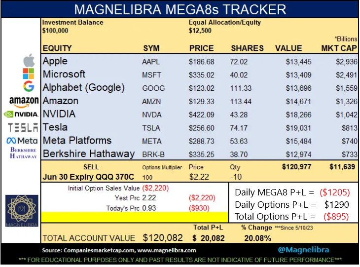 With all that let’s take a look at how Friday settled out on our educational trackers. Here is the Magnelibra MEGA8s where this week the options hedges truly showed their worth as the MEGA8 lost some ground but the options more than made up for the decline. One Friday doesn’t make a trend, but Fridays are usually well bid in equity land but this time not so much, they tried and failed in the Nasdaq. META moved up the ladder to take over the 7th spot from the Berkshire conglomerate: