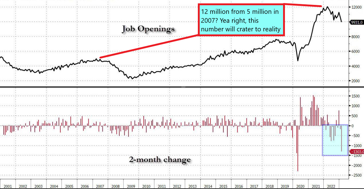 It seems that today’s JOLTs survey showed a continued deterioration in the US job market as the BLS reports nearly 1.3 million jobs have been vaporized from their survey over the last 2 months. We touched on this about a month ago, where we questioned the validity of the nearly 11 million job openings. We don’t believe this number for one second, and its fakery is driven by sites like Zip Recruiter, Indeed, LinkedIn etc. all because of mandates via certain industries, to pretend that there are job openings where there are none. Remember this JOLTs is just a survey, a guess, an extrapolation and if the JOLTs does indeed fall back to reality, say below 8 million, guess what that does to the unemployment rate??? You guessed it, it will move sharply higher, now couple this with the fact that the economy is turning and if layoffs accelerate, that NFP report that this Administration has been fudging the whole time, and which the FRB uses as an excuse to keep rates high, when its all said and done, we suspect a -500k NFP in the next 6 months! Who honestly believed this 12 million number? Even during the 2003 to 2008 housing boom we stayed flat around 4 million, now some how magic 3x growth, seriously: